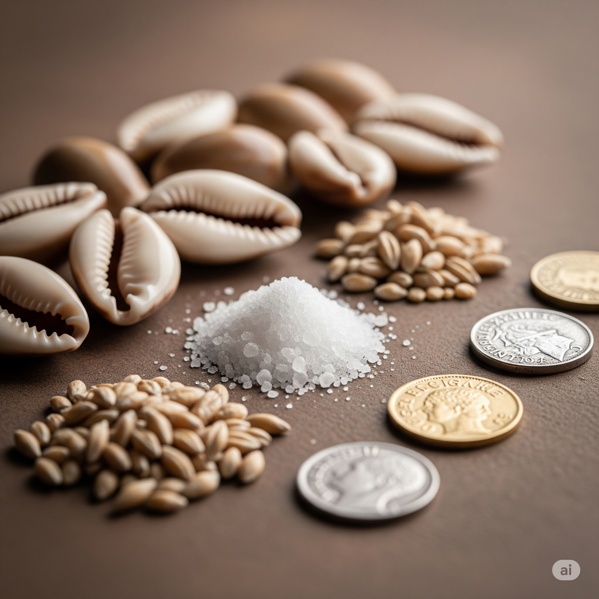 물물교환의 명백한 단점들을 극복하기 위해 인류는 자연스럽게 공통으로 인정하는 가치를 지닌 물건들을 교환의 매개체로 사용하기 시작했습니다. 이것이 바로 화폐의 초기 형태입니다. 특정 사회에서 구하기 어렵거나, 실용적인 가치가 높거나, 상징적인 의미를 지닌 물건들이 자연스럽게 화폐의 역할을 수행하게 된 것이죠.