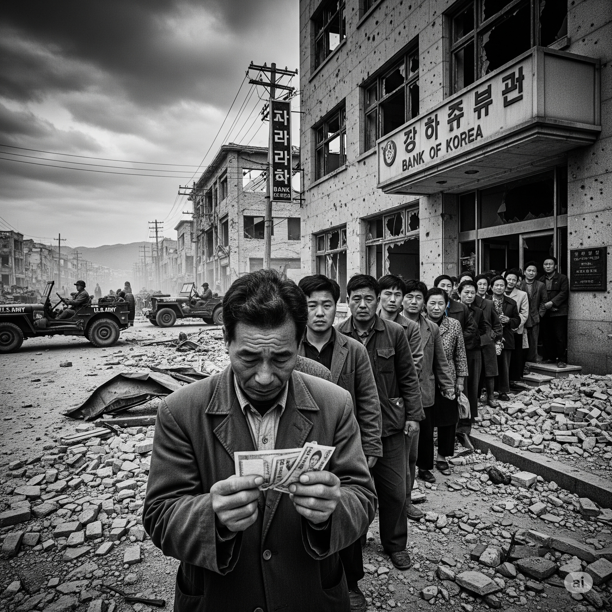 3년여에 걸친 한국전쟁은 대한민국 경제에 엄청난 피해를 입혔습니다. 생산 시설은 완전히 파괴되었고, 인적 자원은 막대한 손실을 입었으며, 국토는 황폐화되었습니다. 금융 시스템 역시 전쟁의 상흔에서 자유로울 수 없었습니다. 은행들은 막대한 부실 채권을 떠안게 되었고, 인플레이션 심화는 서민들의 경제적 고통을 가중시켰습니다. 전쟁이 끝난 후에도 오랫동안 우리 경제는 회복 불능의 상태에 놓인 듯했습니다. 모든 것이 파괴된 잿더미 위에서 다시 시작해야 했으니, 그 막막함은 상상하기조차 어렵습니다.